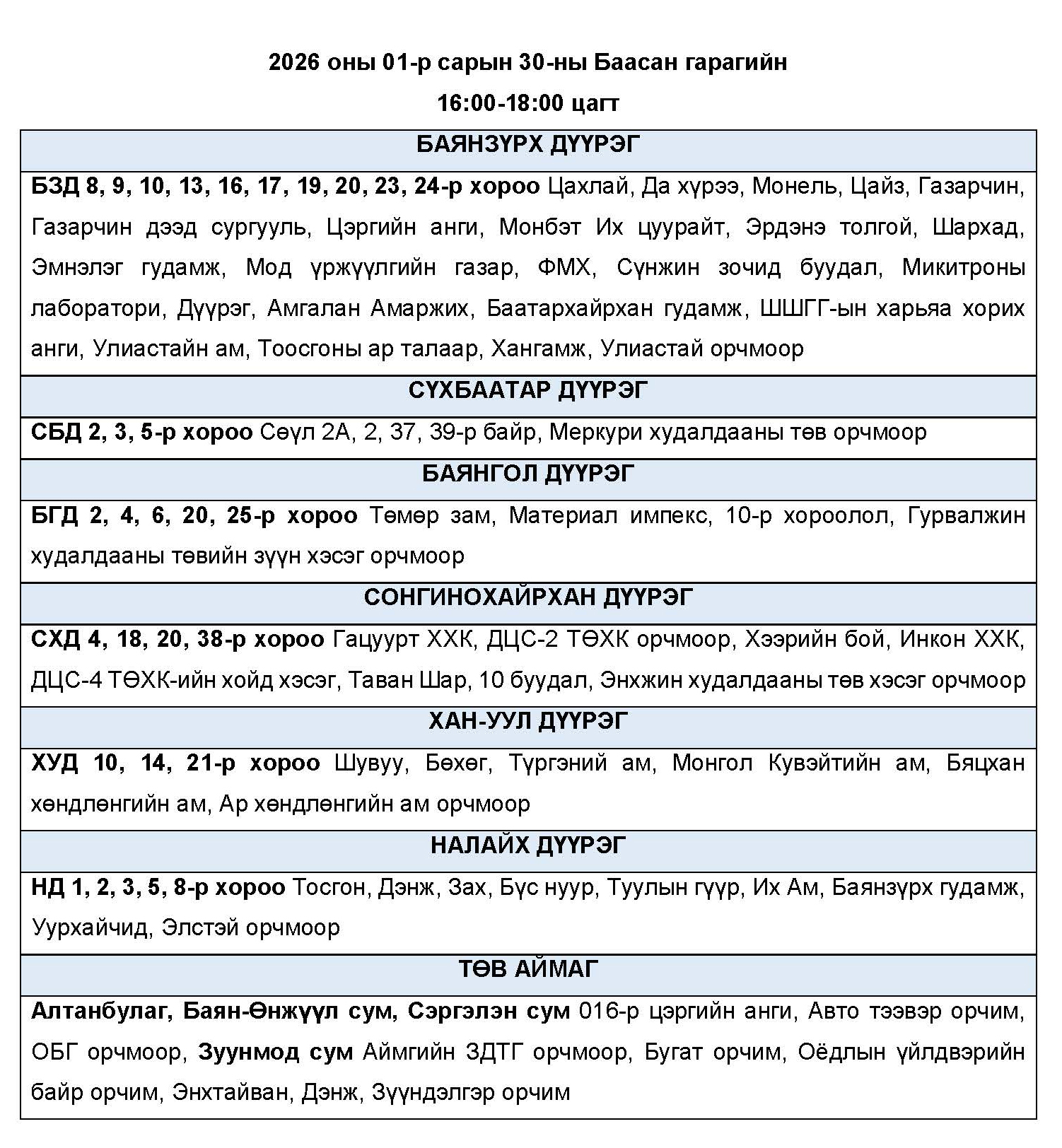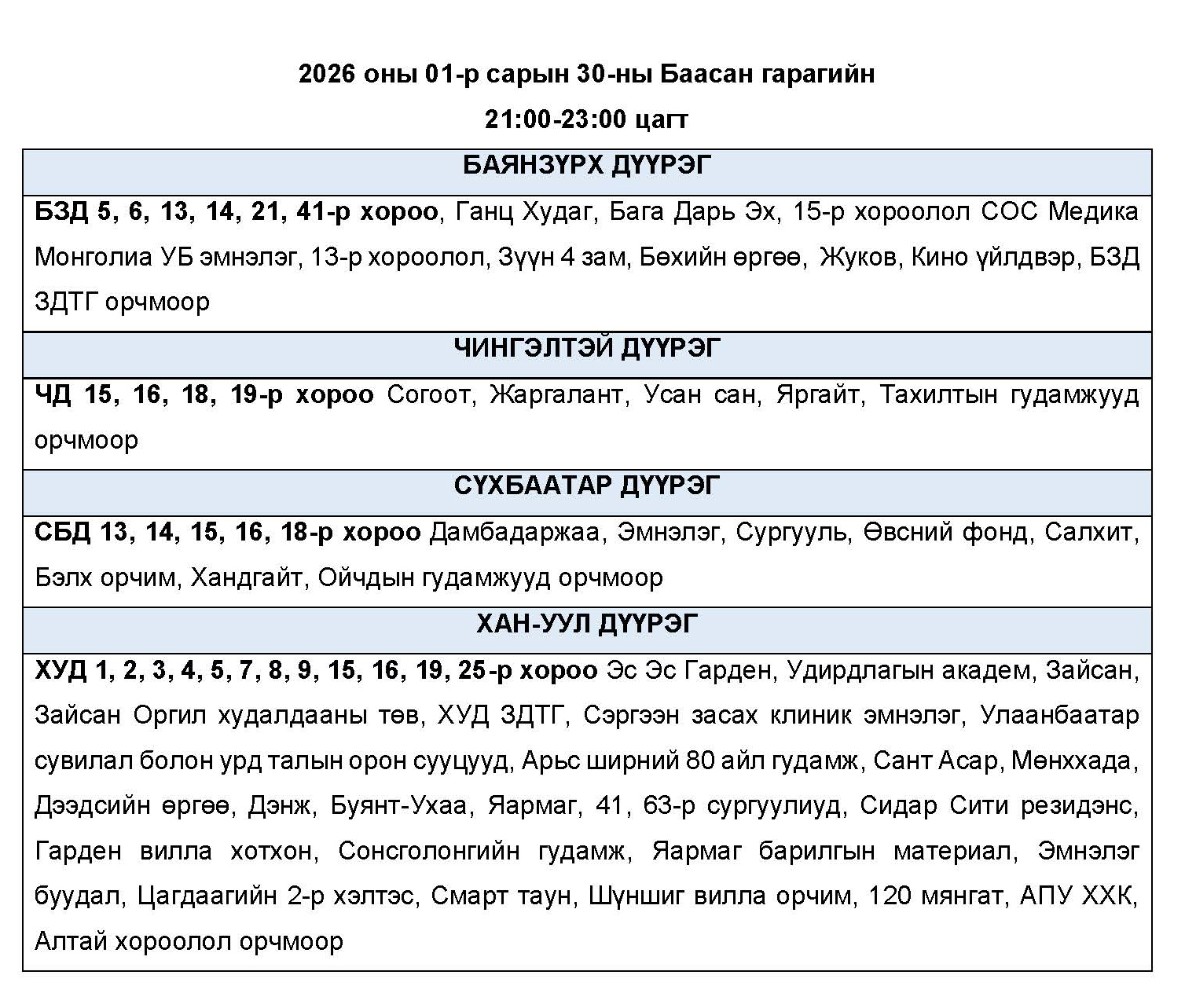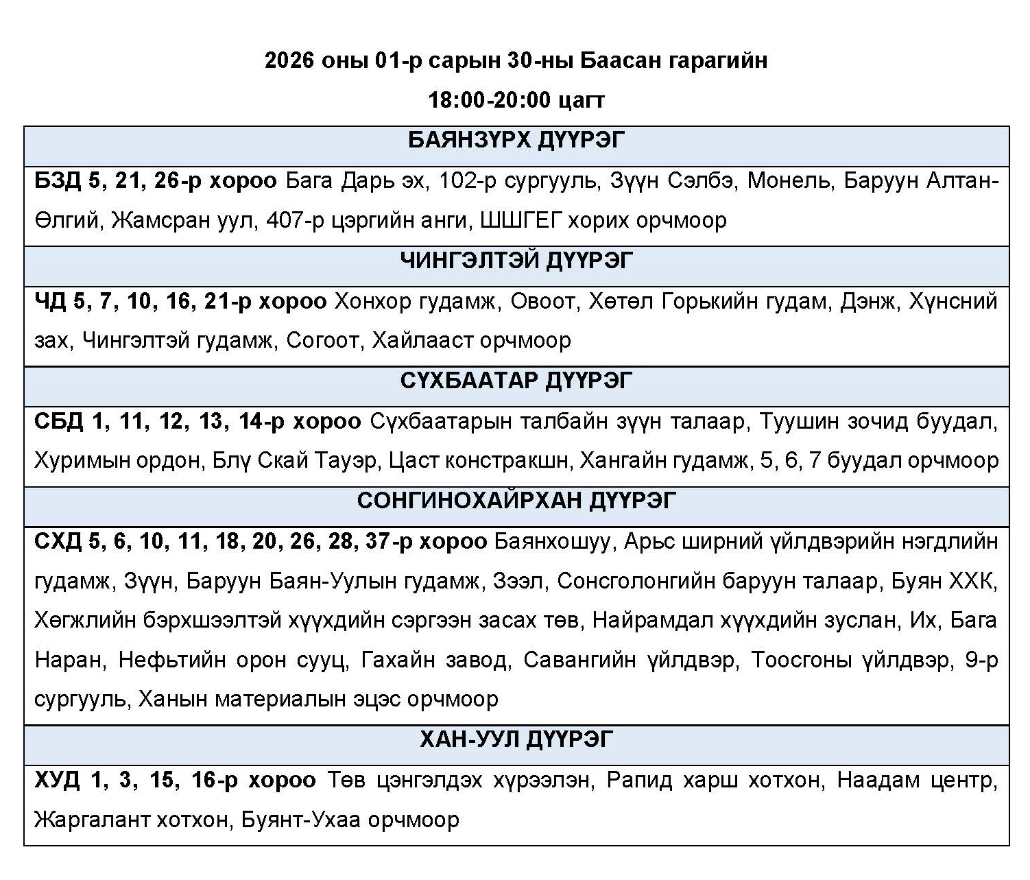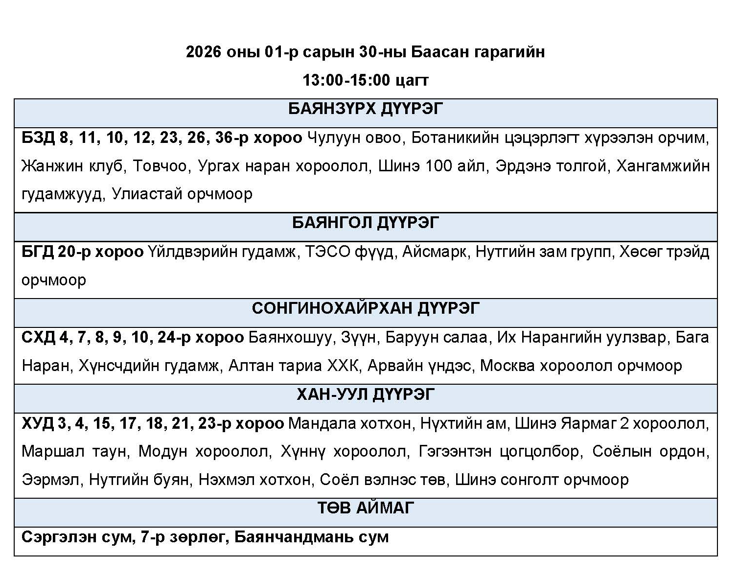 2026 оны 01-р сарын 30-ны Баасан гарагт цахилгаан эрчим хүчний “ХЯЗГААРЛАЛТ ХИЙХ” байршлуудын хуваарь