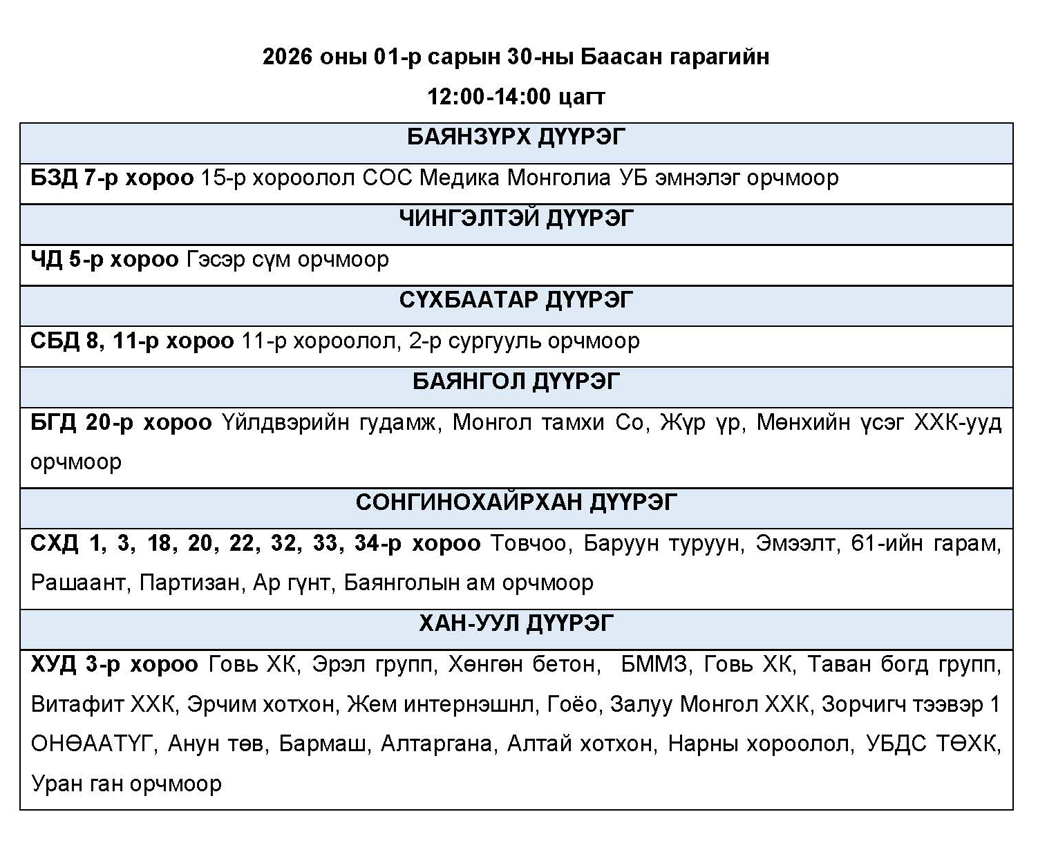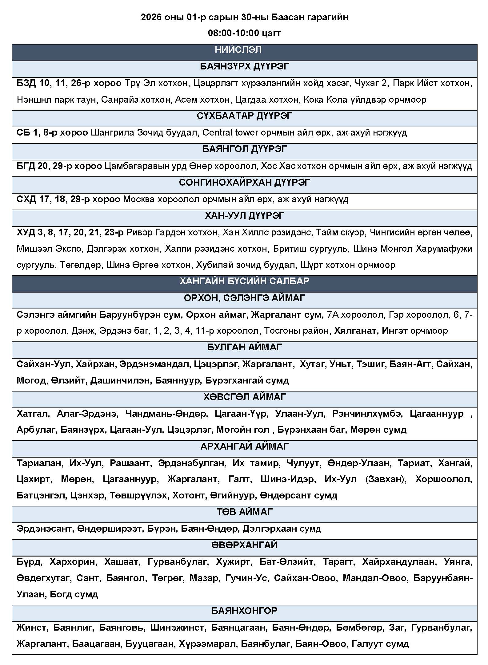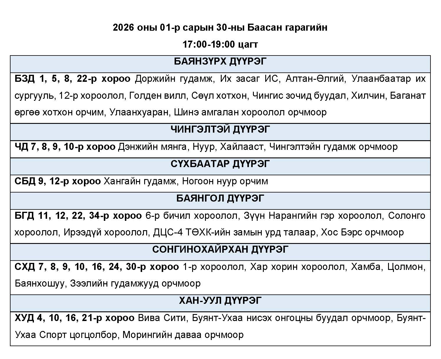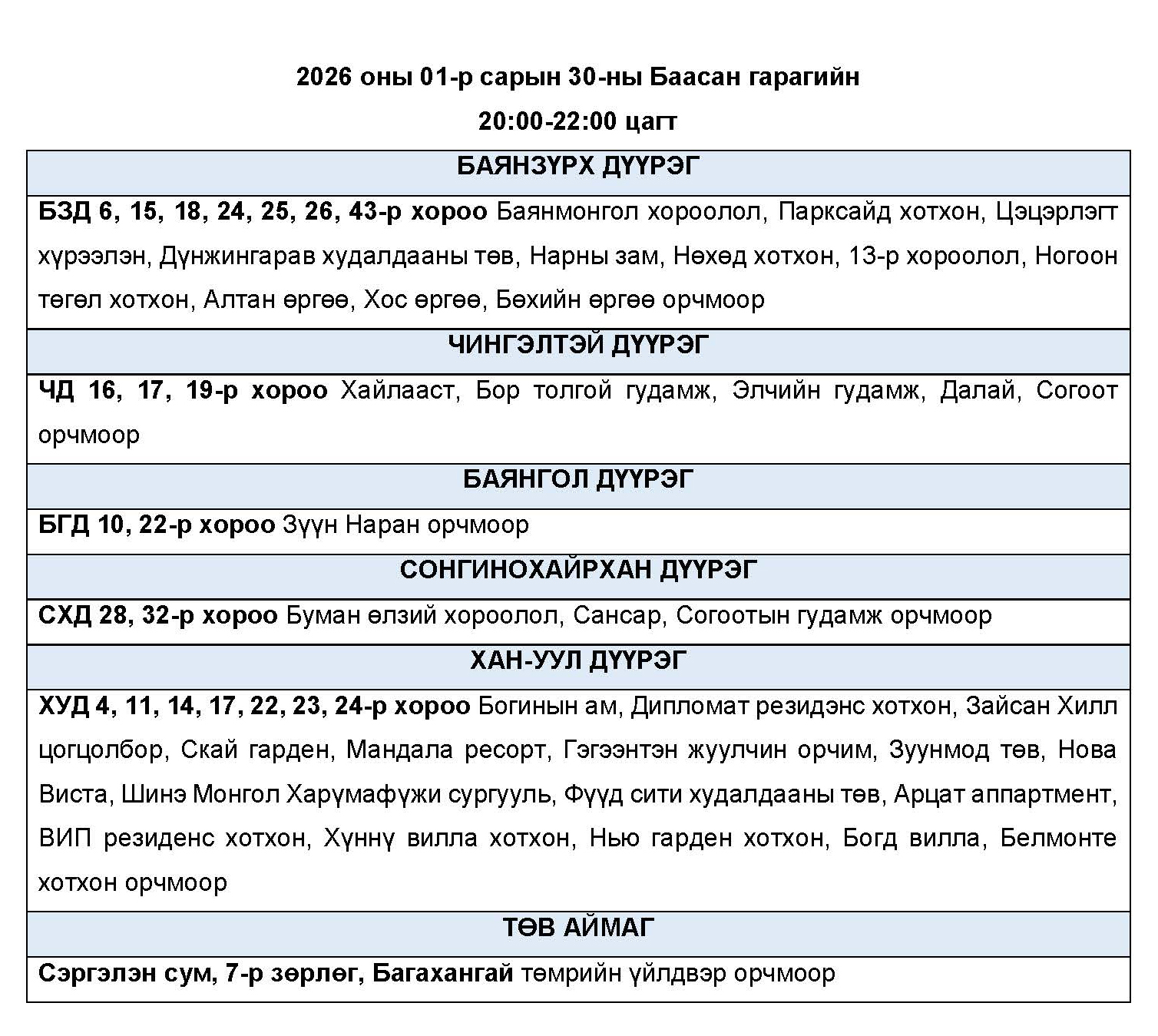 2026 оны 01-р сарын 30-ны Баасан гарагт цахилгаан эрчим хүчний “ХЯЗГААРЛАЛТ ХИЙХ” байршлуудын хуваарь